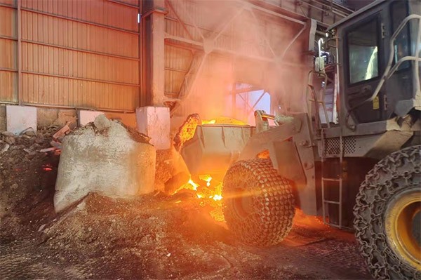 一台南宫NG·28(中国)相信品牌力量装载机轮胎上裹着防滑链冲进车间,在发动机的轰鸣中,铲斗猛地扎进火红的渣堆,铲出一斗冒着火苗和白烟的钢渣,碾压着烧红的地面,在火花四溅中把它转运到另一个车间,然后掉头再次冲向“火焰山”。